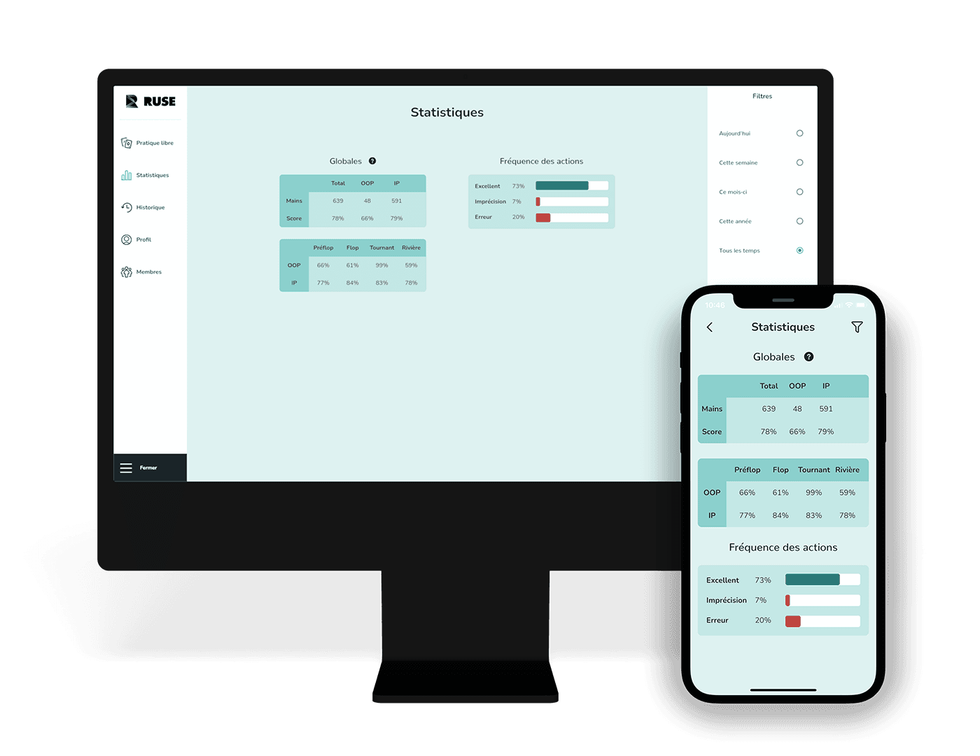 Le jeu génère les statistiques de l’ensemble des mains jouées selon plusieurs critères tel que la position et la fréquence des actions. Il est aussi possible de filtrer les résultats dans le temps, pour visualiser son amélioration. Le score vous donne une mesure de performance globale basée sur l’écart entre l'espérance mathématique de votre action et celle de l'action optimale.