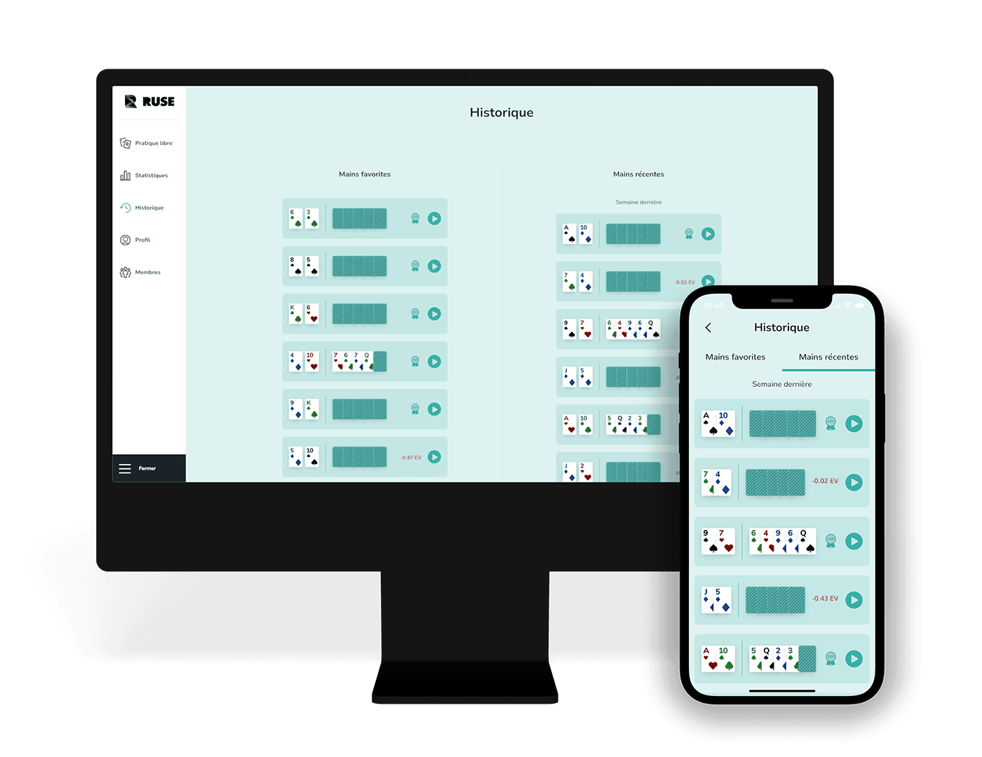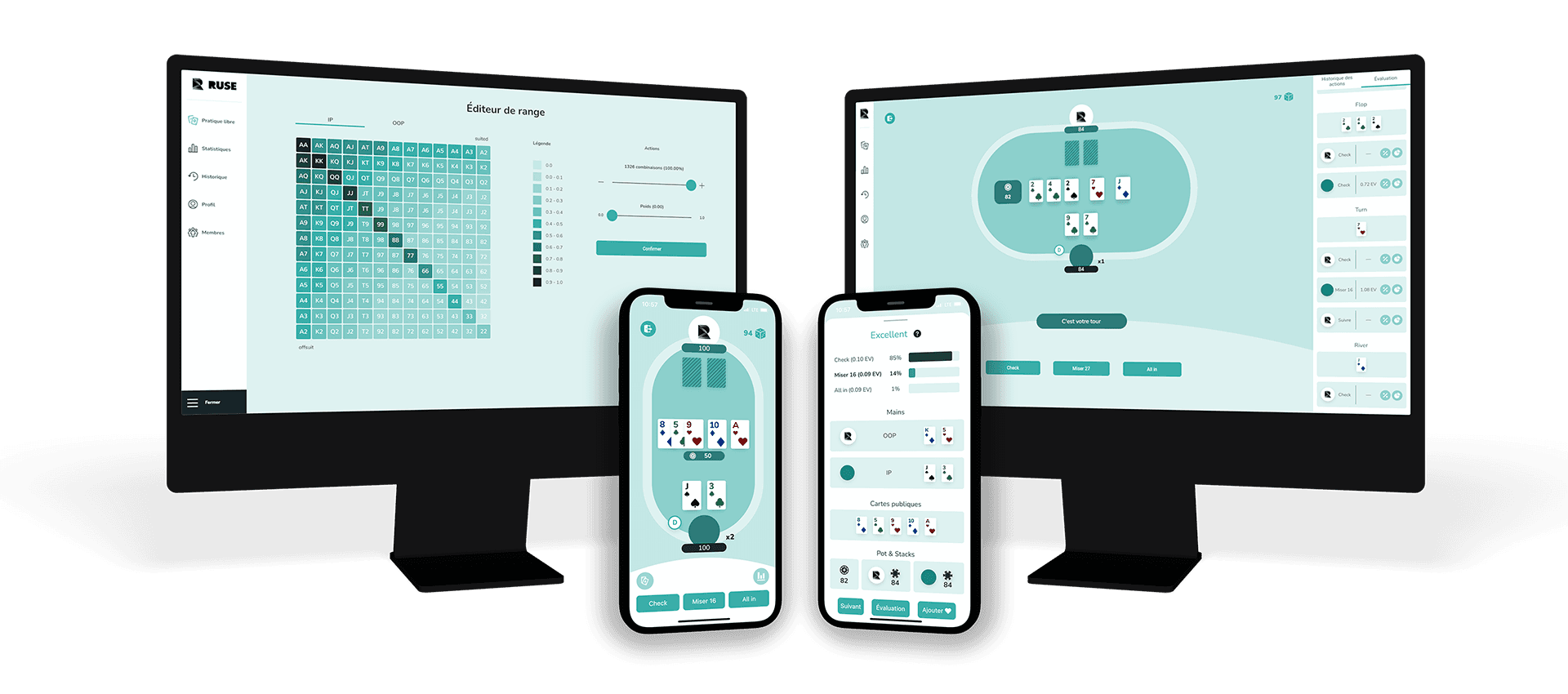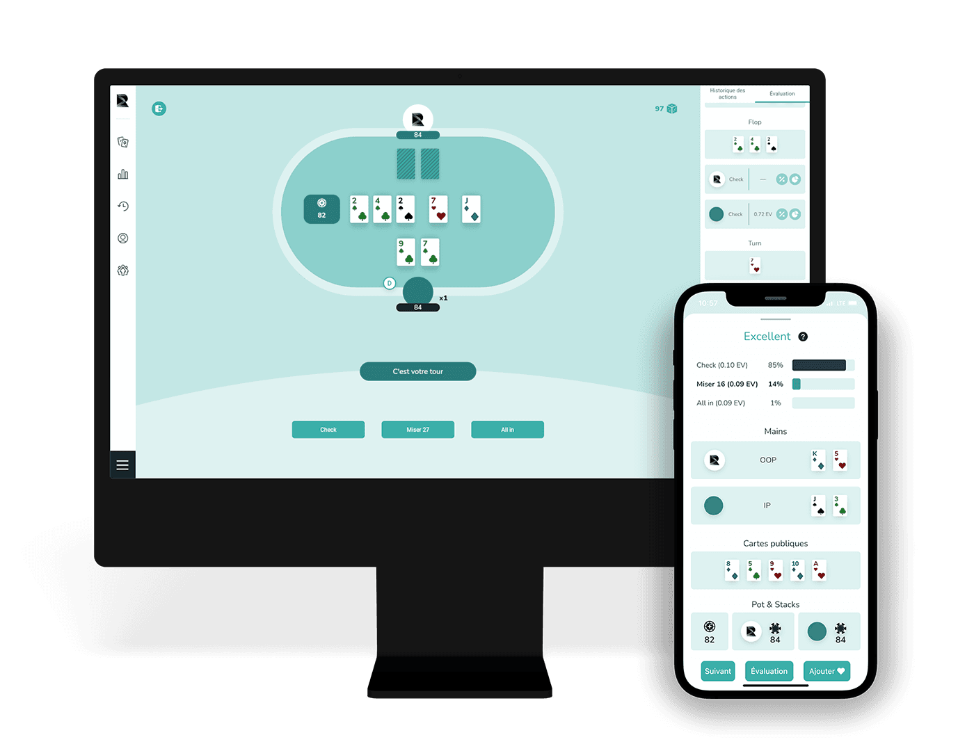 Nous avons développé une application mobile et une application web permettant de jouer au poker contre un entraîneur personnalisé et interactif s’adaptant en temps réel au niveau du joueur. De plus, la plateforme enregistre les statistiques de jeu et la progression du joueur au fil du temps.