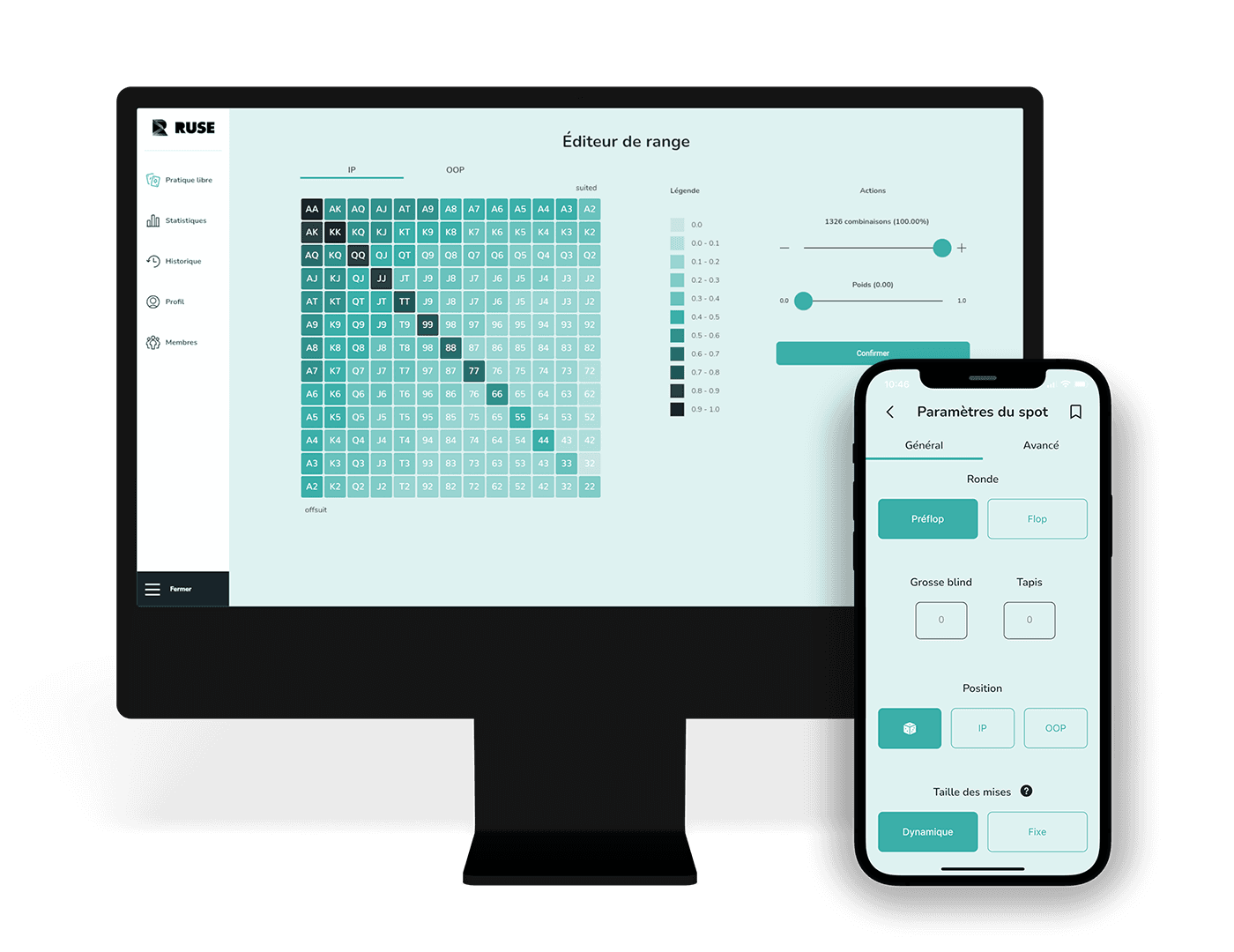 Le joueur peut choisir de commencer la main au préflop ou au flop. Il peut aussi choisir le mode dynamique ou fixe pour la taille des mises. Tous les paramètres du jeu peuvent aussi être personnalisés, tels que la position, la taille des blinds ainsi que le pot, le tout pour rendre l’expérience la plus personnalisée possible. Si le joueur choisit de jouer à partir du flop, il peut choisir les cartes de la table et modifier l’éventail de mains (range). Il est aussi possible de sauvegarder ses paramètres pour les rejouer plus tard ou même d’utiliser les paramètres par défaut de Ruse pour une expérience de jeu optimale.